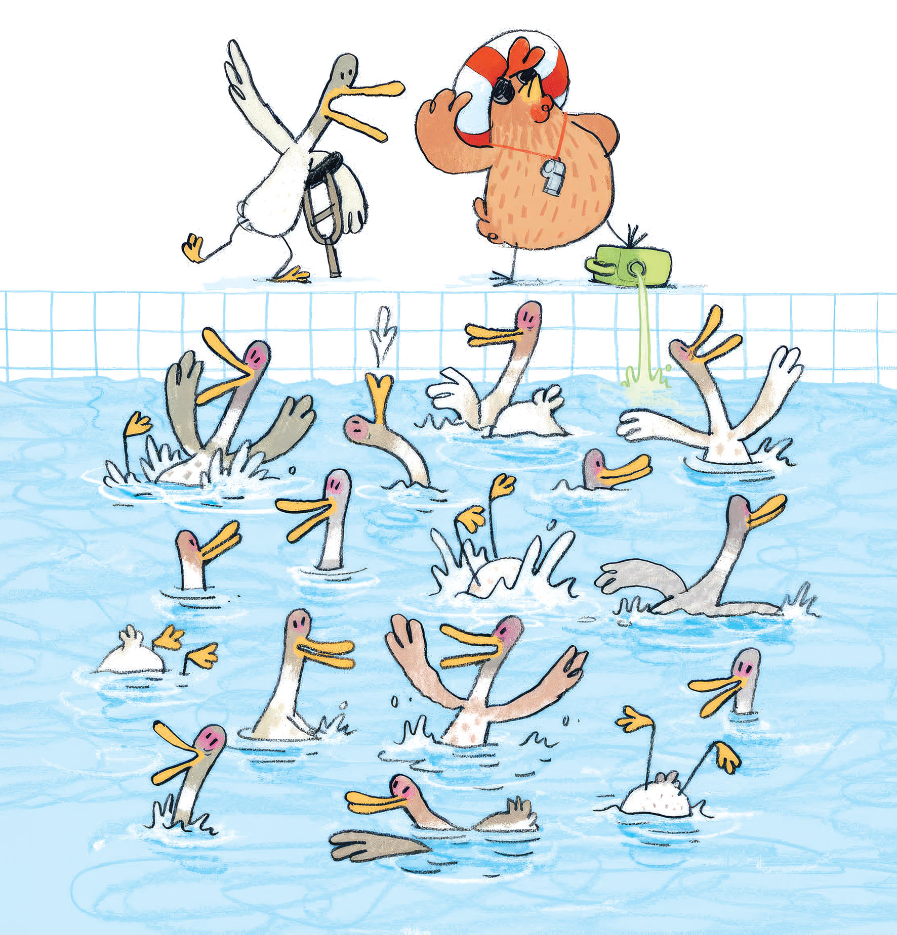 Na hun bijzondere reis in De avonturen van manke eend en blinde haan, dit keer een nieuw avontuur van deze twee beste maatjes! Want dat zijn ze, ondanks hun zeer verschillende karakters. In Bommetjes verboden! komen manke eend en blinde haan in het buitenzwembad terecht. De toegang blijkt alleen voor eenden, maar haan zou haan niet zijn, als hij niet toch naar binnen weet te komen. De beide vrienden raken elkaar al snel kwijt en ieder heeft zo zijn eigen agenda om er een heerlijke dag van te maken, vol plezier en interessante ontmoetingen. Maar als alle eenden naar huis zijn en het nacht wordt in het zwembad, zijn haan en eend blij om weer met z’n tweetjes te zijn!